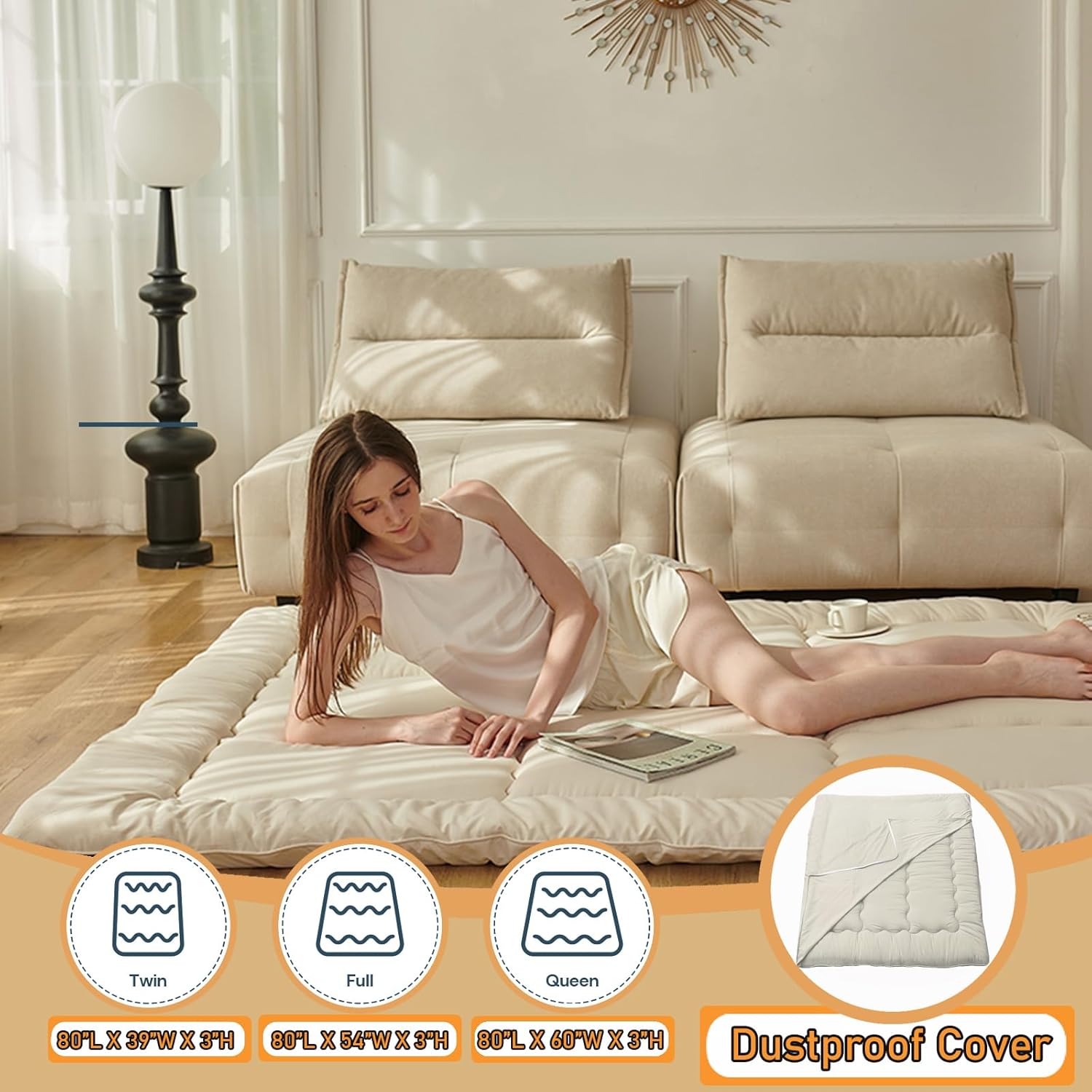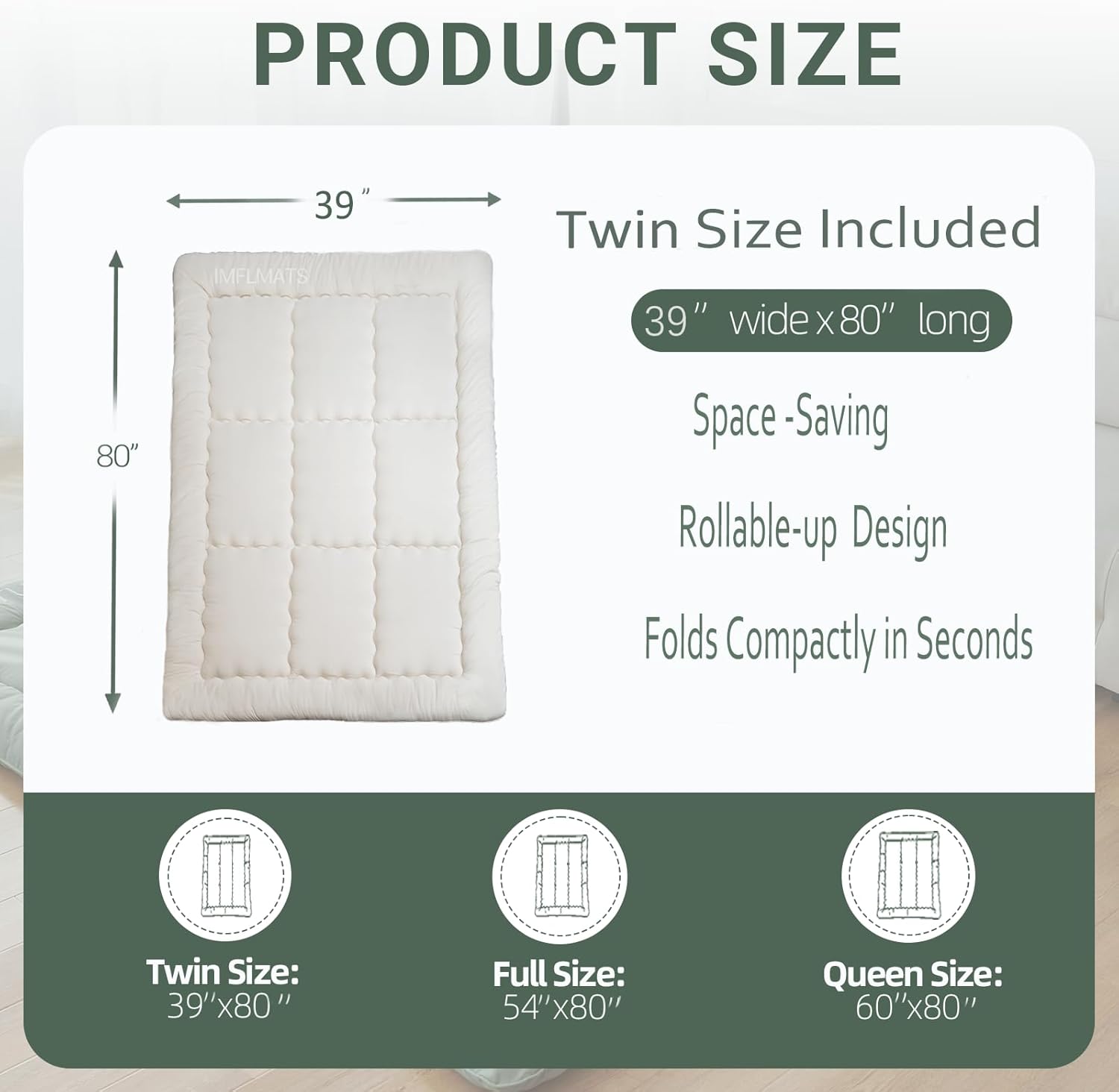 [UPGRADED WORKMANSHIP]:Japanese futon mattress designed for floor sleeping and tatami mats.We Adopt soft polyester filling For The Top And Bottom Layer Of sleeping mattress for floor, Breathable And Skin-Friendly.Upgraded 25D High-Density Base Support Foam,Offer An long-lasting support For Long-Term Uses.High-quality filling provides just-right cushioning for sleep, play,or relaxation–whether indoors or outdoors.