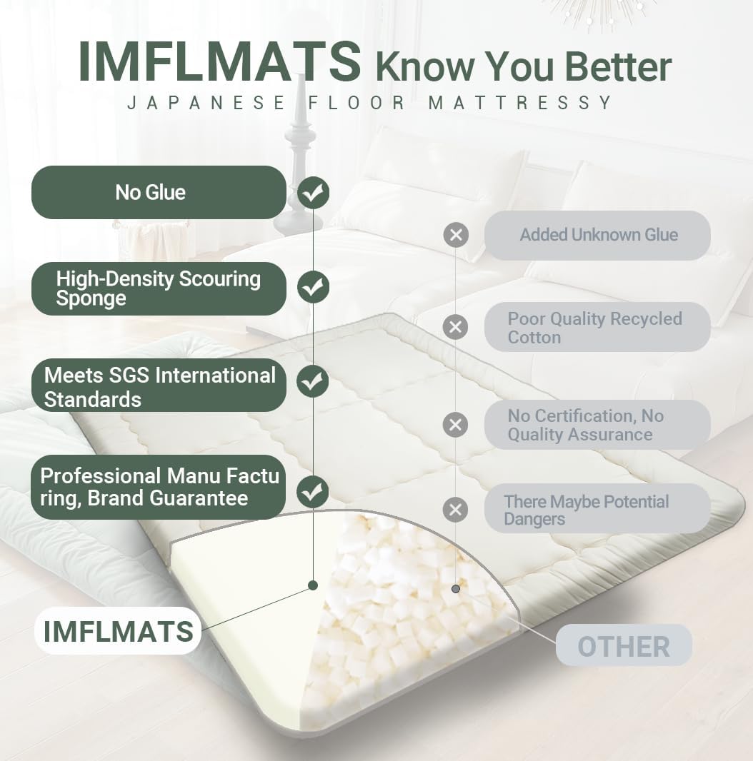 [IMPORTANT CARE INSTRUCTIONS]:To ensure Memory Foam Futon Mattress safe shipping,we compress the Floor mattresses for sleeping tightly,For best results,air-dry your floor mattress in direct sunlight for 2-3 days after unpacking.This helps it fully expand and regain its original thickness and softness.