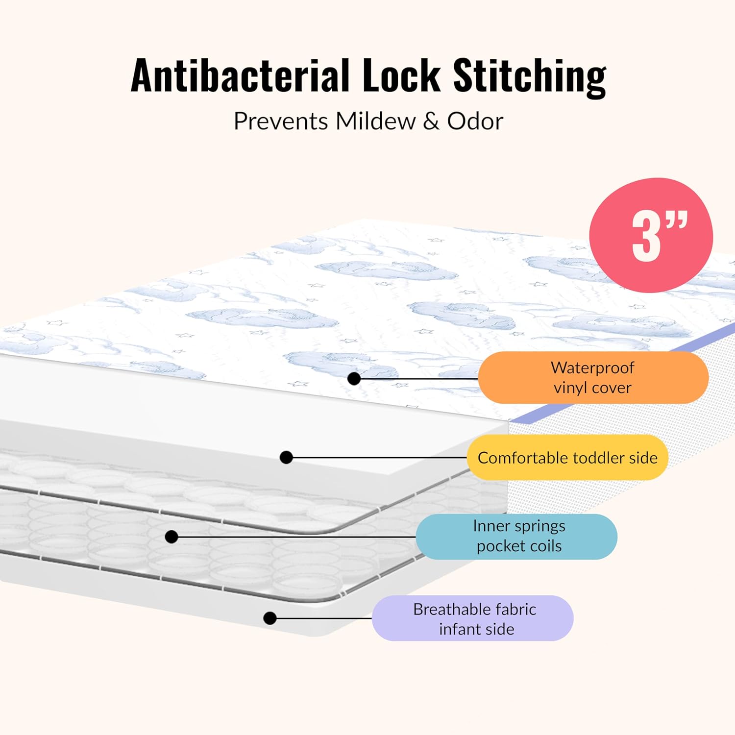 Dream On Me, 2-In-1 Breathable 3″ Spring Coil Portable Crib Mattress offers supreme comfort and quality. Our mattress is designed to fit portable and Mini cribs it features interwoven steel coil that’s wrapped in CertiPUR-US certified layer for comfort these mattress are covered with a breathe -flow material on the infant side and a waterproof cover on the toddler side with lock stitch seams. Dream On Me mattress meets the Federal Flammability Standard.