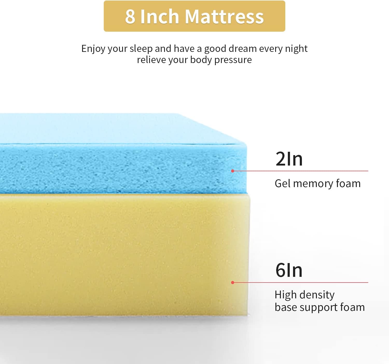 Layering: Our 8 inch mattress provides a 2 layer full foam system. : 6″ base support foam, plus a 2″ gel memory foam. The base support foam helps support your body while the gel memory foam shapes to your body providing the most comfort.
