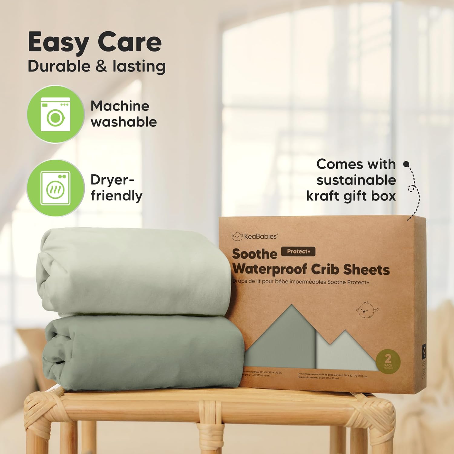 2-Pack Fitted Crib Sheets – Each KeaBabies Soothe Protect+ Baby Crib Sheets set comes with 2 waterproof crib sheets for both boy and girl that can perfectly fit the standard nursery crib mattresses sized at 52” x 28” and height of 3” to 8”.