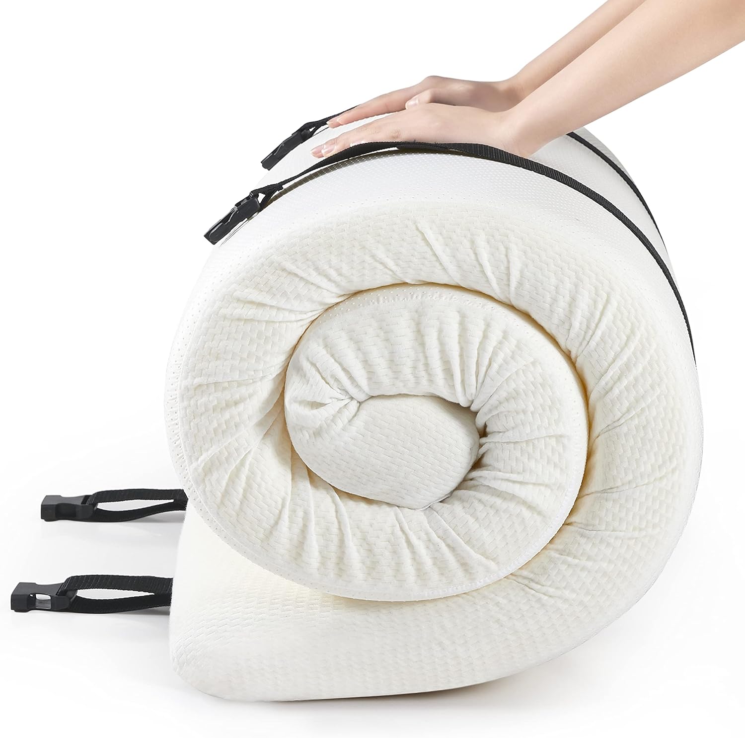 Portable And Slip Resistant:The four corners of the mattress have a fixed rope, and the bottom of the mattress is made of slip resistant fabric, which can ensure that the durable topper won’t slip on slick floors, bed, RV or cot frames.Comes with a storage belt, roll up the mattress, you can easily store it.Take this camping mattress with you when traveling as a tent bed or sleeping in your camper van.Our sleeping foam pad provides great comfort on all your adventures.