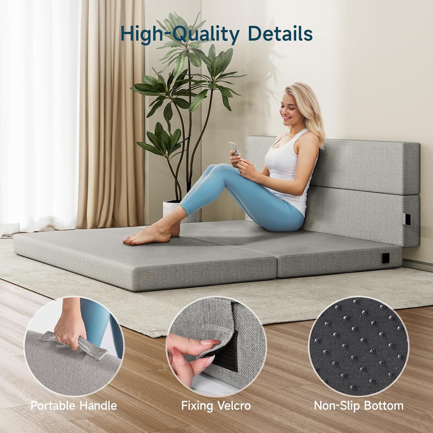 8 reviews for 4 Inch Folding Mattress Full, Firm Portable Mattress Topper, Foldable Sofa Bed, Memory Foam Topper with Storage Bag, Washable Cover & Handle Design, Indoor/Outdoor Use for Camp, RV, Gray