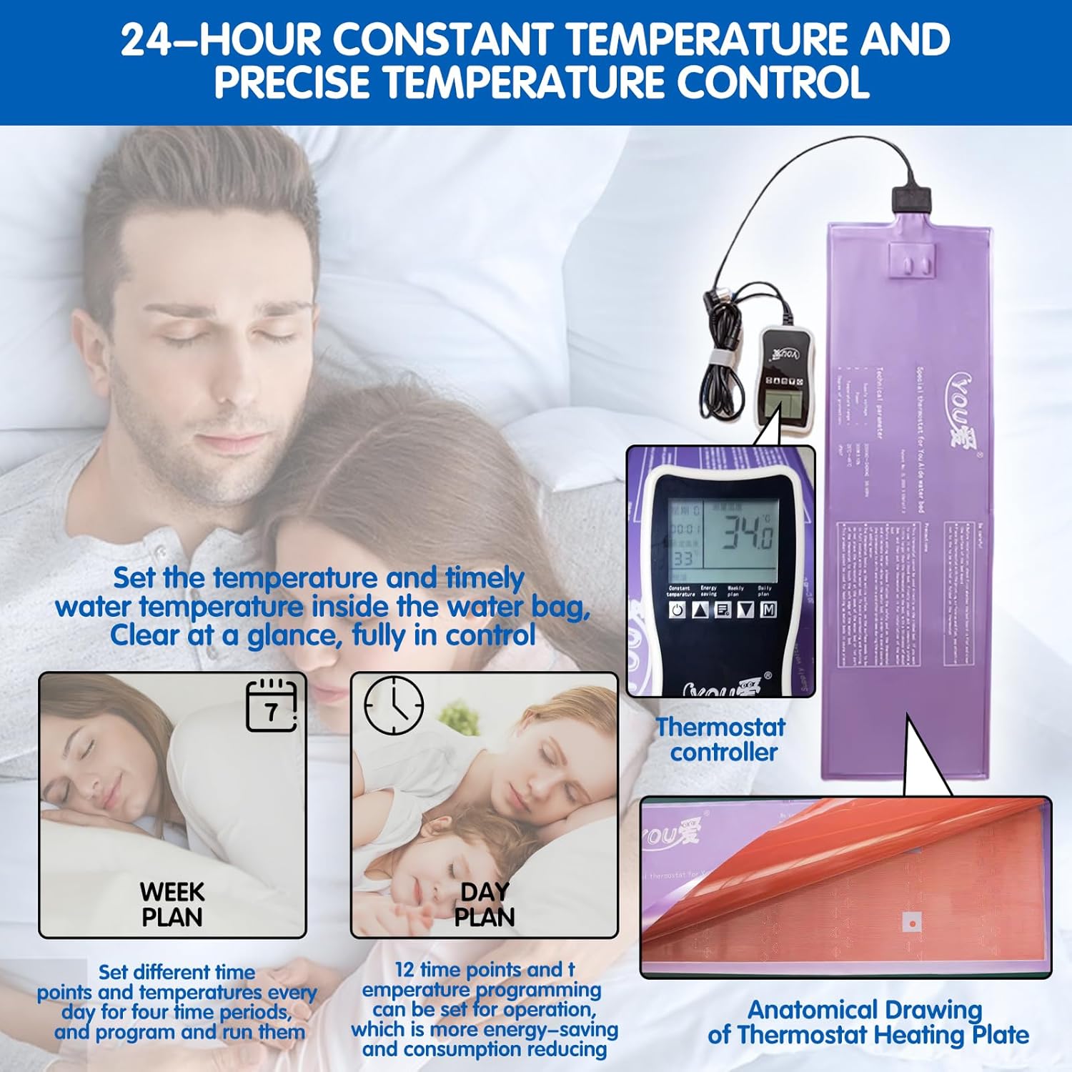 【Heating thermostat】: Waterbed set is equipped with an upgraded leak-proof thermostat, which uses intelligent heating thermostat technology, the temperature duration can be freely adjusted, and the temperature is constant for 24 hours. This thermostat has a digital large screen display, it makes it easier for us to use.