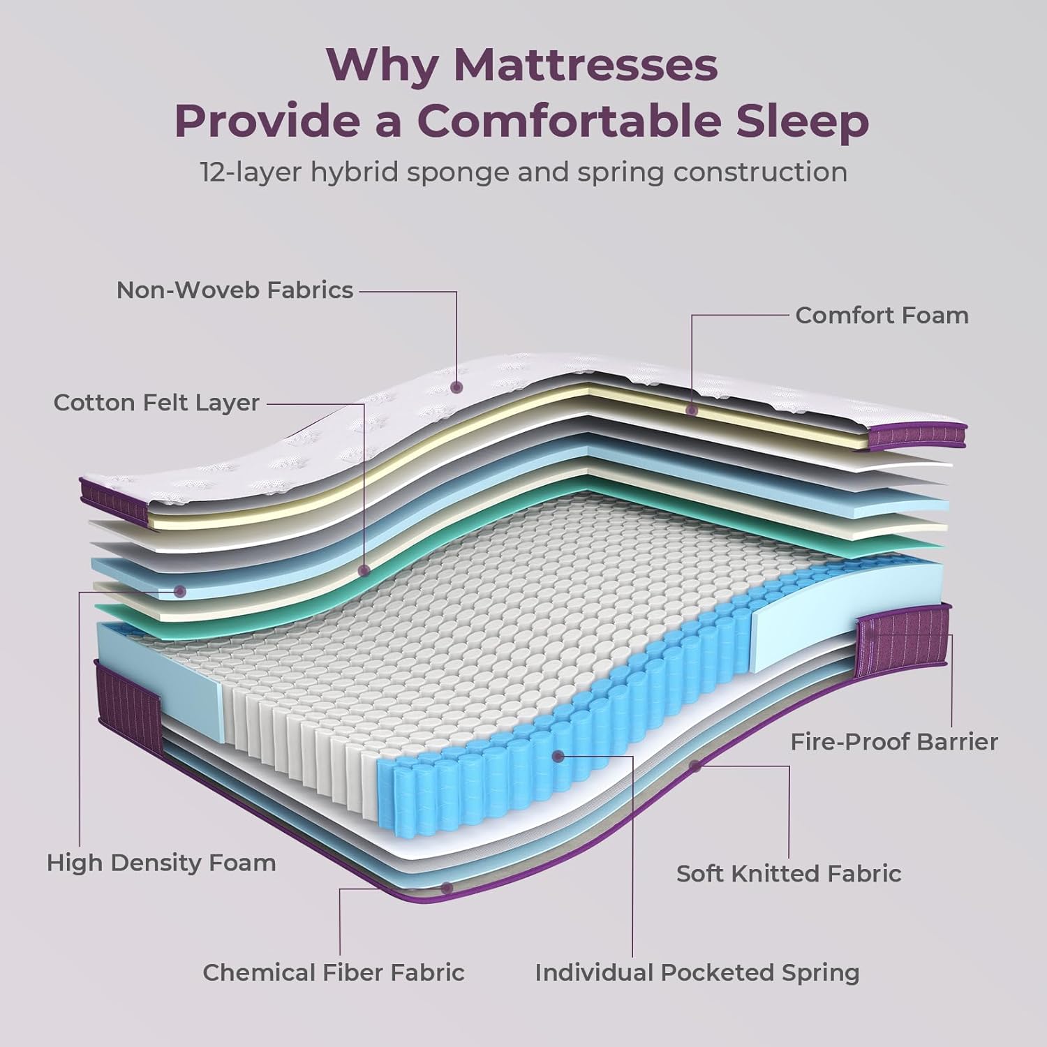 Silent Comfort: This queen mattress 12 inch uses a high-density 600 independent pocket spring system to ensure that each spring works independently, providing precise support and effectively reducing vibration and interference. Combined with high-performance sound-absorbing sponge, 12 inch queen mattress can effectively absorb the sound generated by turning over, preventing the turning from disturbing your partner or pet. Ensure you have a deep sleep all night and enjoy undisturbed recovery and relaxation