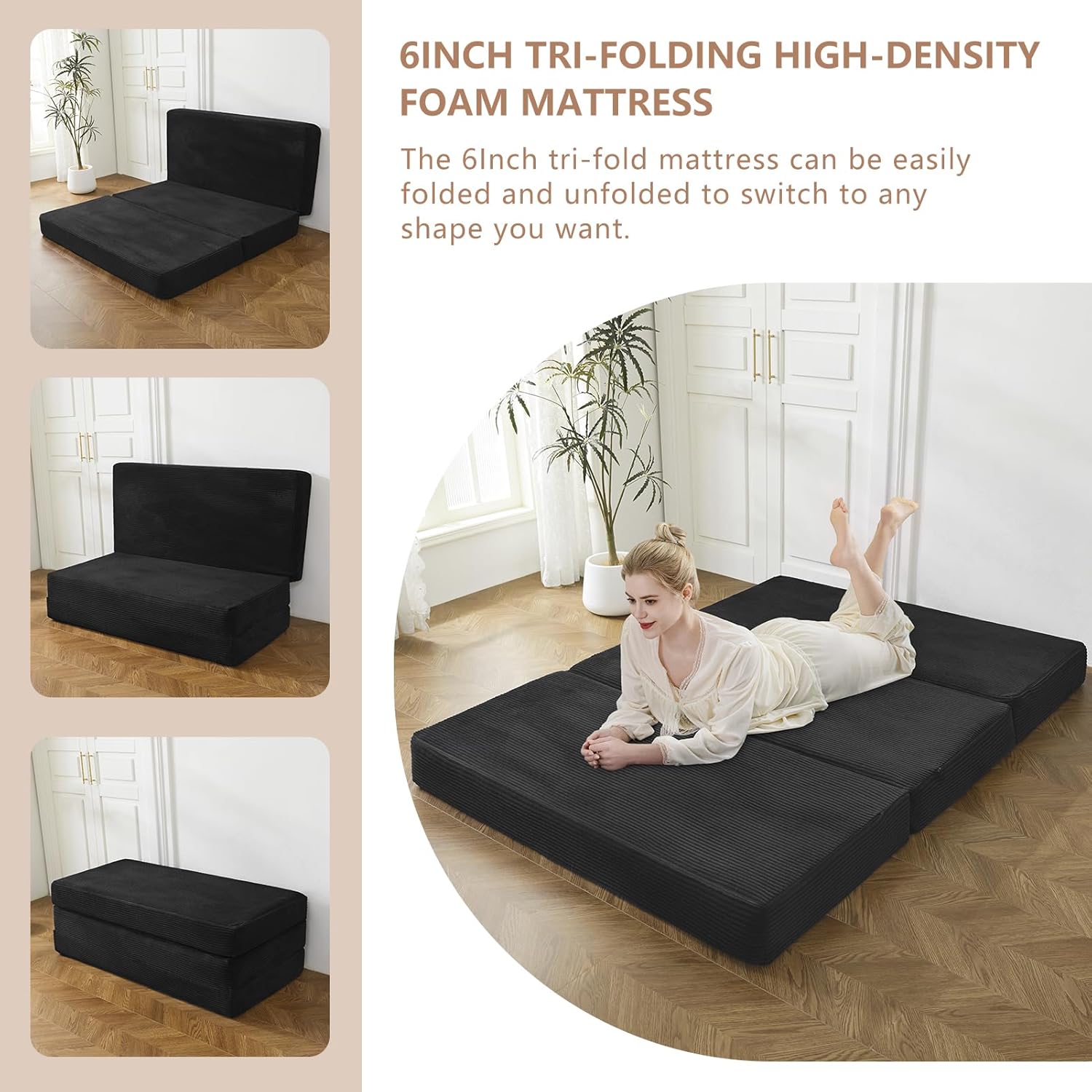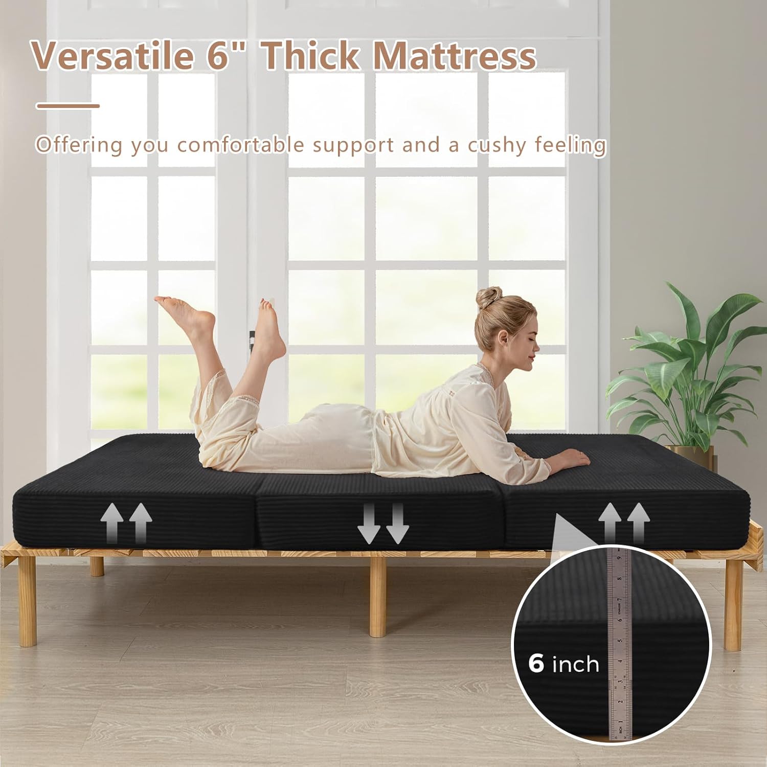 Comfortable and Supportive: With a thickness of 6 inches, our foldable corduroy mattress offers a plush and supportive sleep surface. It conforms to your body’s natural curves, relieving pressure points such as shoulders, hips, and back. Enjoy a restful night’s sleep without waking up feeling sore or achy