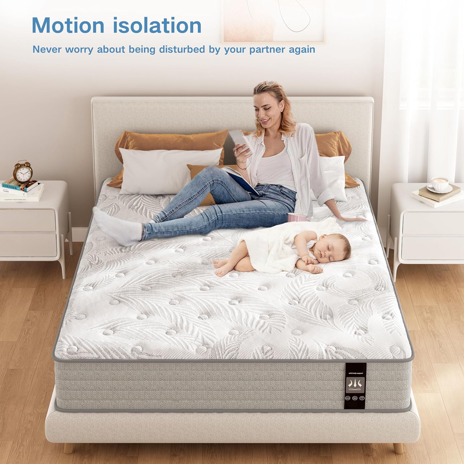 【Edge Support and Motion isolation】Built-in high quality independent pocket springs and slow rebound foam, can effectively absorb the noise and vibration generated by tossing and turning during sleep, will not be woken up by the noise, will not disturb your companions.