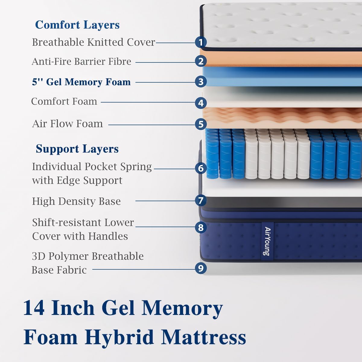 🛏ENJOY A COOL SLEEP: Unlike other ordinary hybrid mattresses, the AirYoung mattress contains a 5 inch layer of gel memory foam. The gel particles embedded in the foam can actively absorb and disperse body heat, keeping the mattress surface temperature stable in the comfort zone. The gel layer + honeycomb open cell structure allows you to sleep dry even in hot and humid weather.”When others toss and turn, you can enjoy the natural air-conditioned room under the covers all night long”.