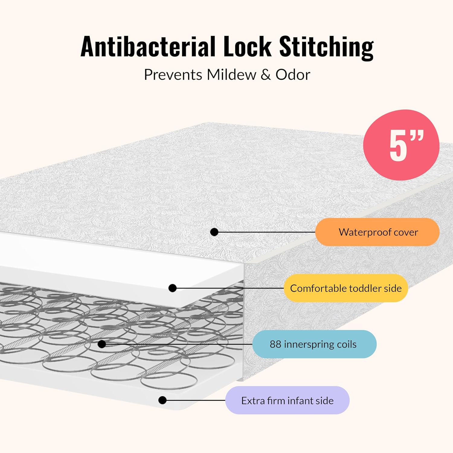 EXTRA FIRM & SUPPORT: The mattress 88 interwoven, heat tempered coils, 6-gauge steel border wire around perimeter of mattress offers a firm foundation and excellent support to meet the needs of your sleeping baby.