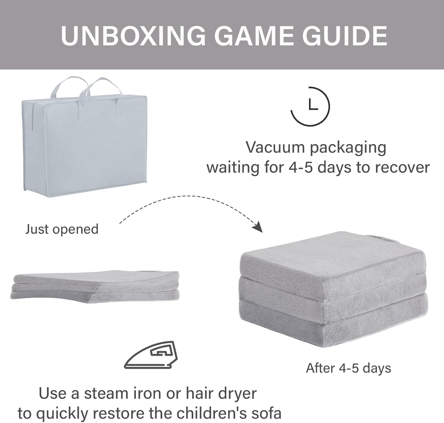 【Kids Folding Chair Bed Requires No Assembly】The kid’s folding mattress is in vacuum packing. Open the Kids Couch packaging and you will get a soft plush Sofa for your kids. Please allow 4-5 days for the kids sofa couch to take on its original shape or use a clothing steamer to restore its thickness and remove creases quickly.