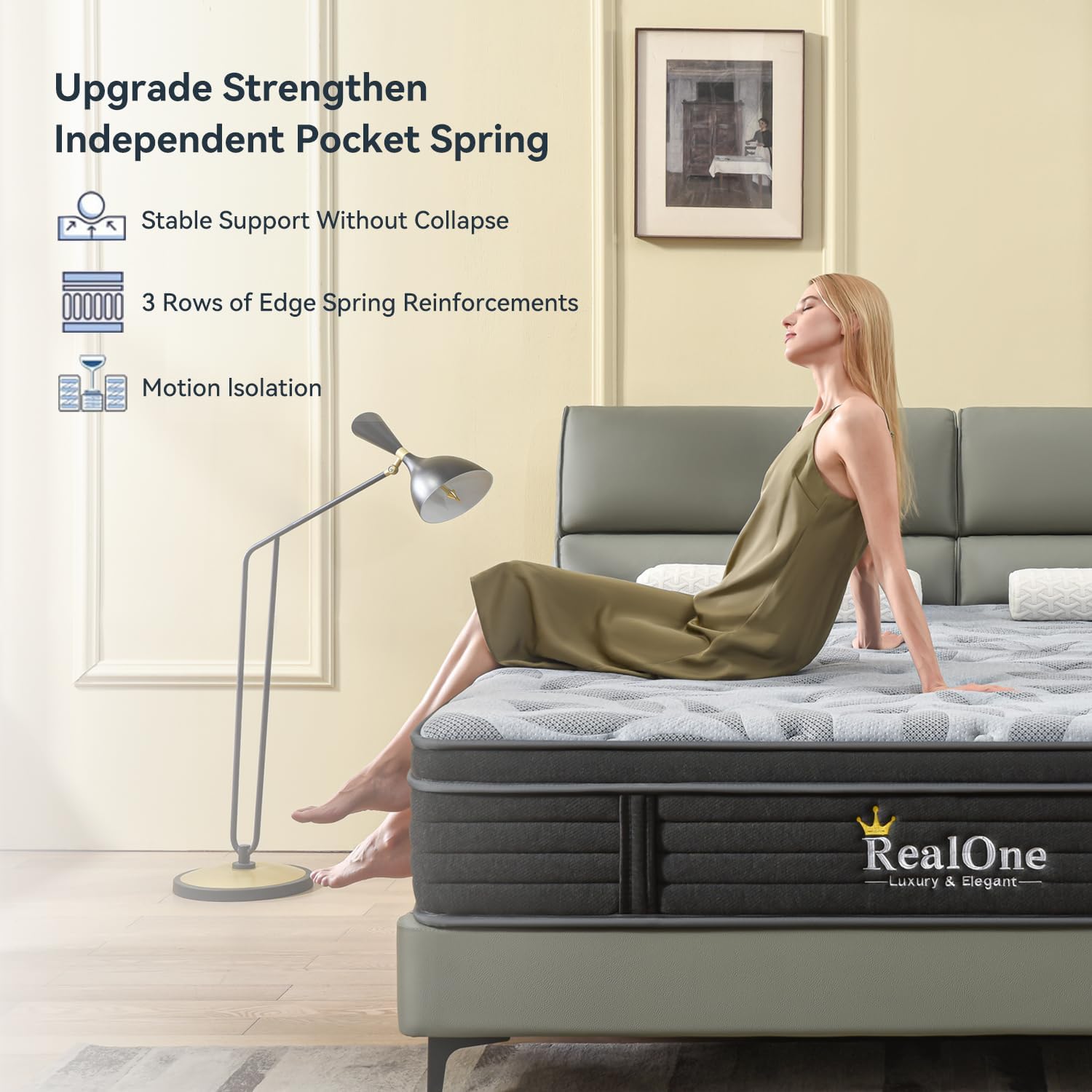 I was a little skeptical about ordering a mattress online, but the REALONE King Size 12-Inch Mattress (it fits perfectly for my California King bed frame~) has completely exceeded my expectations! From the moment I unboxed it, I could tell this was going to be a game-changer. It expanded quickly and fully, and there was minimal odor â which disappeared after a few hours.The medium firm feel is just right â supportive enough to keep your back aligned, but soft enough to cradle your body comfortably. The memory foam layer adapts to your shape and relieves pressure on shoulders, hips, and lower back. I used to wake up with stiffness and soreness, but not anymore!One of my favorite features is the individually pocketed springs. They really do a great job at minimizing motion transfer, so even when my partner moves or gets in/out of bed, I hardly feel a thing. Perfect for light sleepers like me!The cooling fabric is another big plus. I tend to sleep hot, but this mattress helps regulate temperature really well â I no longer wake up sweaty or uncomfortable in the middle of the night. Itâs breathable and helps keep things fresh. Also worth noting: the CertiPUR-US certification gave me peace of mind knowing it’s made with safe, non-toxic materials. It really does check all the boxes â comfort, quality, support, and value.Overall, this mattress has truly transformed my sleep. If you’re looking for a well-balanced, durable, and affordable king-size bed, I highly recommend giving this one a try. You wonât regret it!