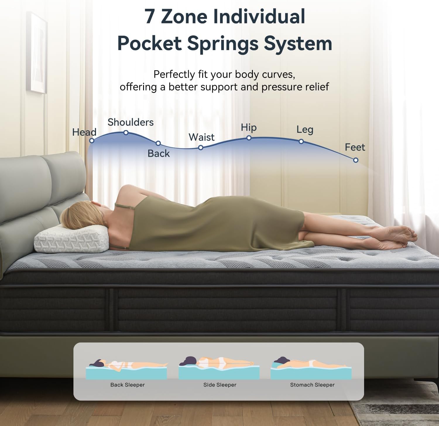 Independent 7-Zone Pocket Spring System: RealOne 10 Inch Full Size Mattress Designed to provide targeted support for different body parts such as the head, shoulders,back, waist, hips, legs, and feet, it perfectly conforms to body curves. Suitable for back, side, and stomach sleepers, it effectively reduces pressure relief from every part of your body and enhances sleep quality.