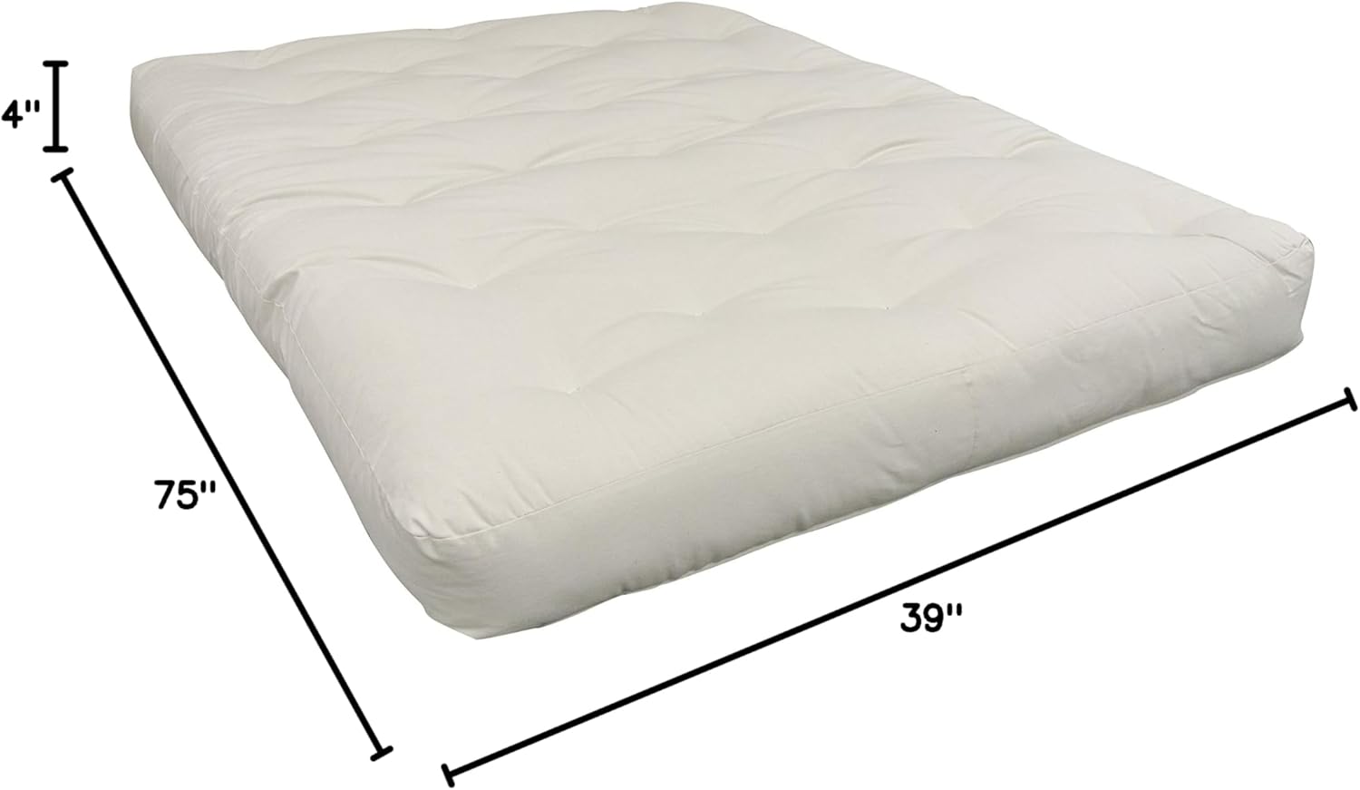 4″ All Cotton #604 Twin Natural Futon Mattress has a firm surface feel. The All Cotton has more densely packed cotton inside for durability and firmness. Gold Bond uses a custom-blended “JOY” cotton batting for resilience and longevity. This is the perfect starter futon mattress. Mattress available in various sizes and colors.