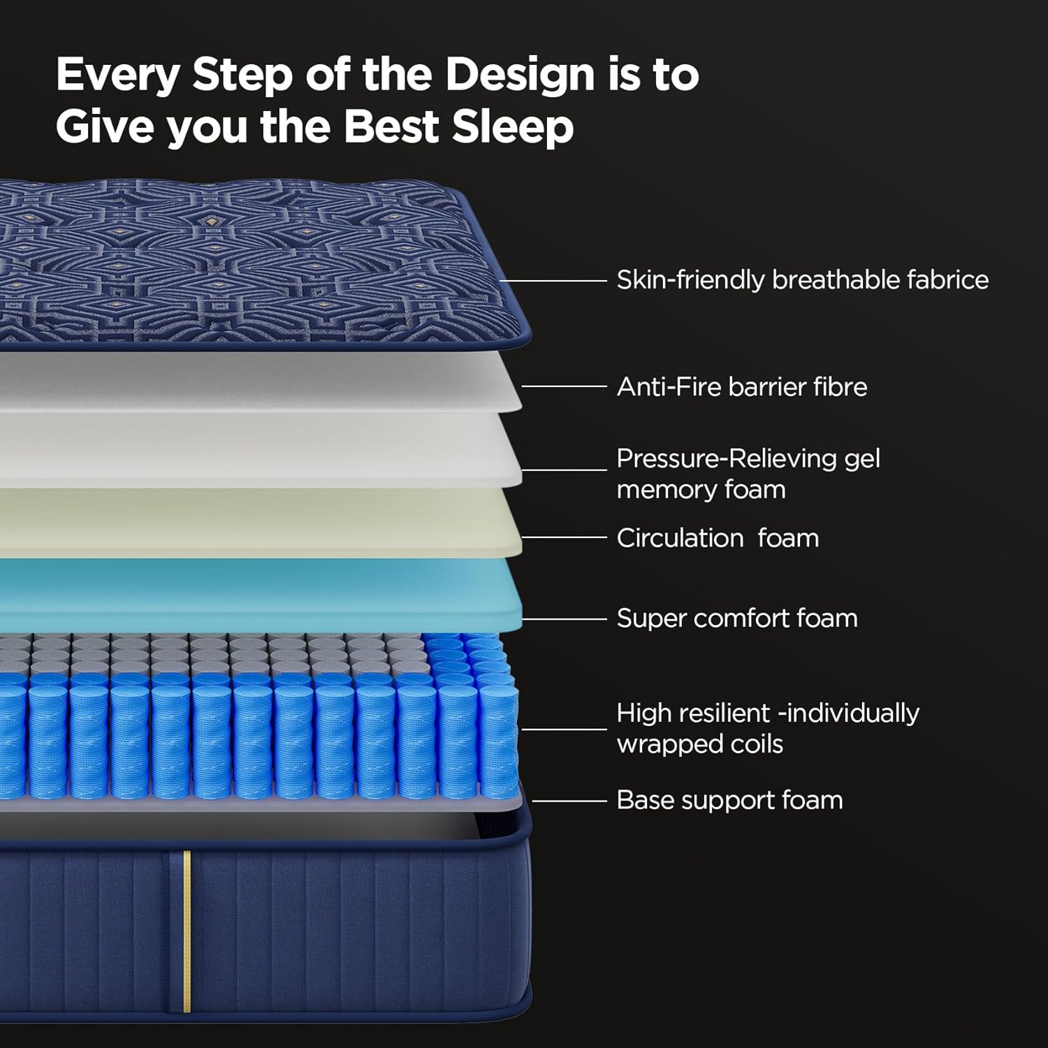 Superior Comfort: Dive into comfort with our high-resilient individually wrapped coils and circulation-gel memory foam. This combination provides excellent support, pressure relief, and breathability for a cool sleep experience.