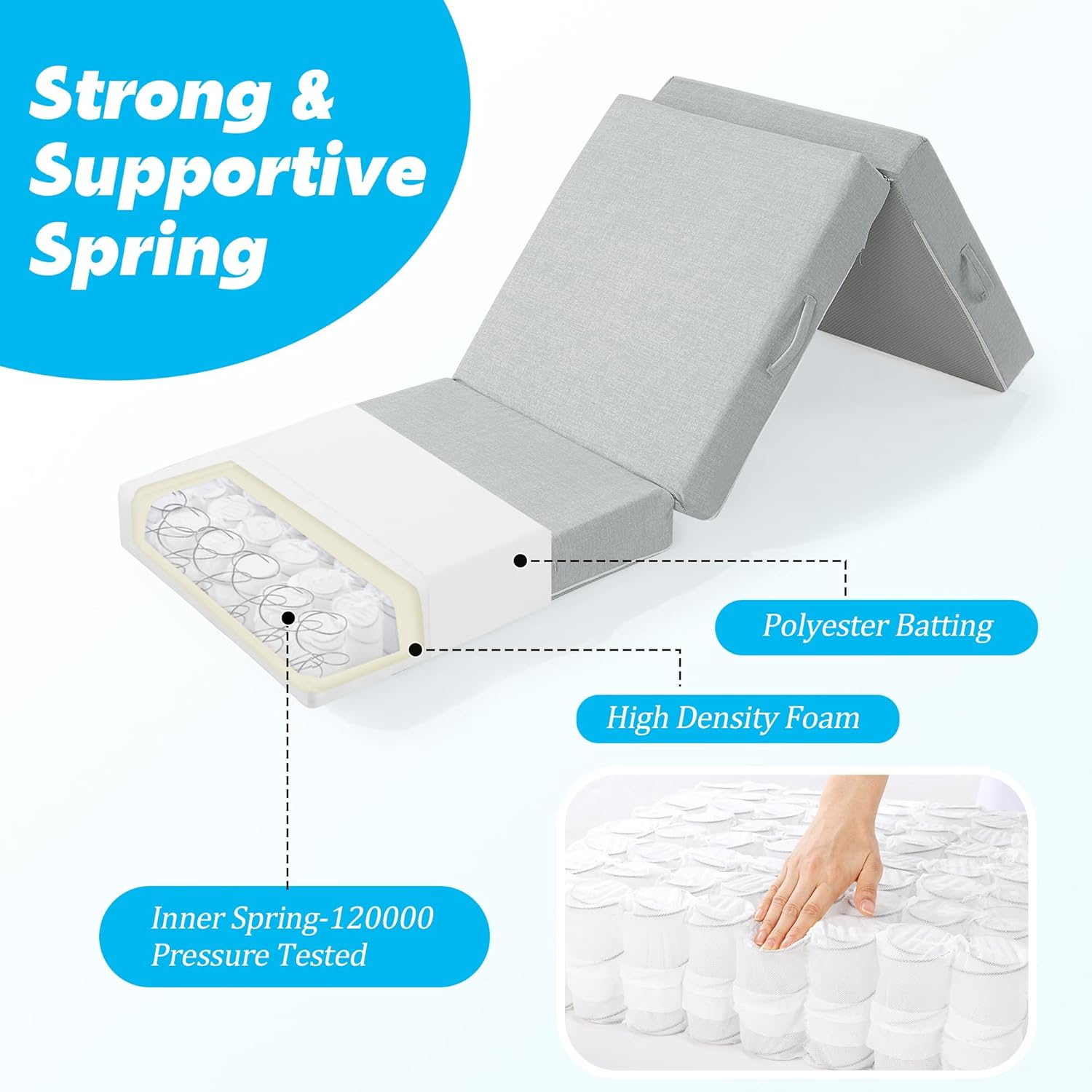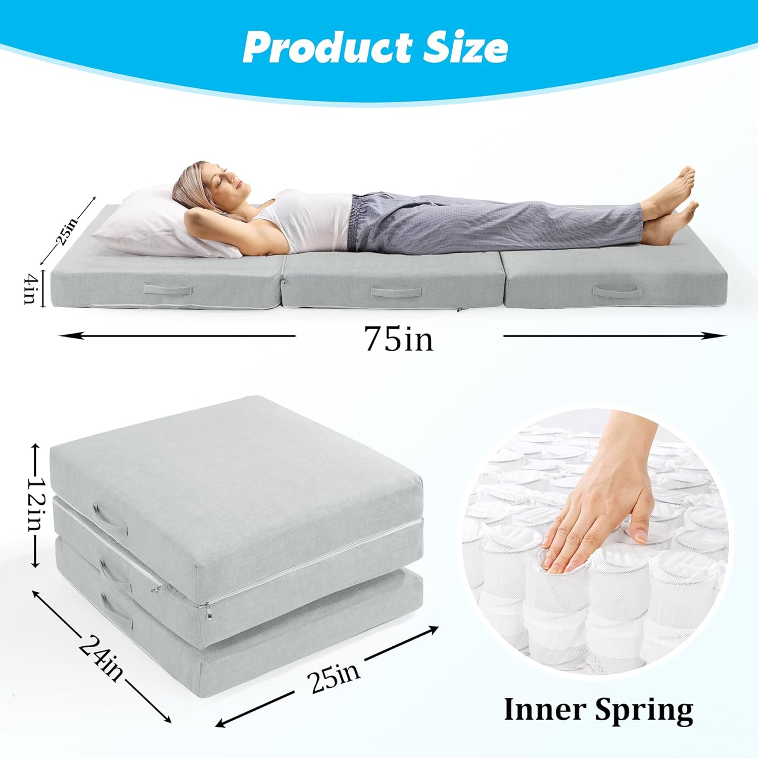 HOMBYS High Density Foam Trifold Floor Mattress with Inner Spring,Foldable Floor Bed Mattress Single Size,Portable Folding Mat,Guest Sleeping Mattress for Floor,4 inch Temporary Bed,75″x25″x4″,Gray