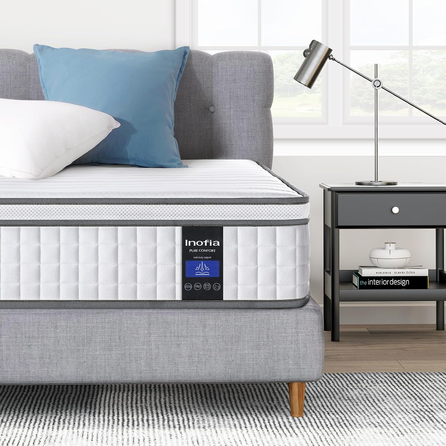 【Cool & Comfortable Sleep】Inofia hybrid pocket innerspring mattress has advantage over traditional mattresses, avoid sinking in or sleeping hot. The breathable top cover is skin friendly and comfortable to touch, helps to wick away moisture and dissipate body heat. Great temperature control thanks to innovative heat-dissipating side net cloth around the cool memory foam and strong airflow circulation of pocket springs underneath, creating a comfortable sleep experience
