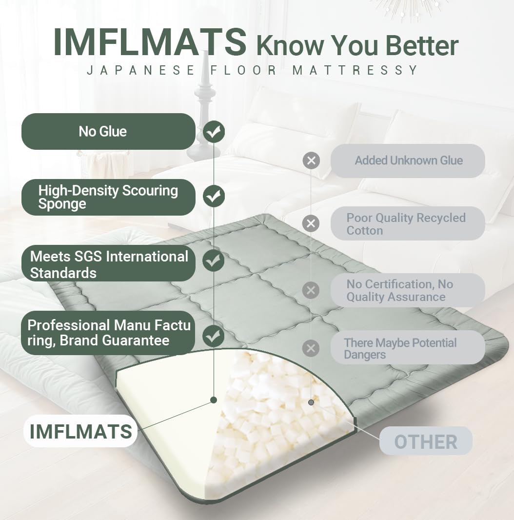 [UPGRADED WORKMANSHIP]:Japanese futon mattress designed for floor sleeping and tatami mats.We Adopt soft polyester filling For The Top And Bottom Layer Of sleeping mattress for floor, Breathable And Skin-Friendly.Upgraded 25D High-Density Base Support Foam,Offer An long-lasting support For Long-Term Uses.High-quality filling provides just-right cushioning for sleep, play,or relaxation–whether indoors or outdoors.