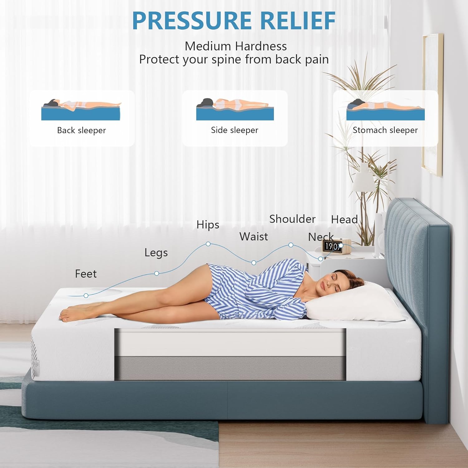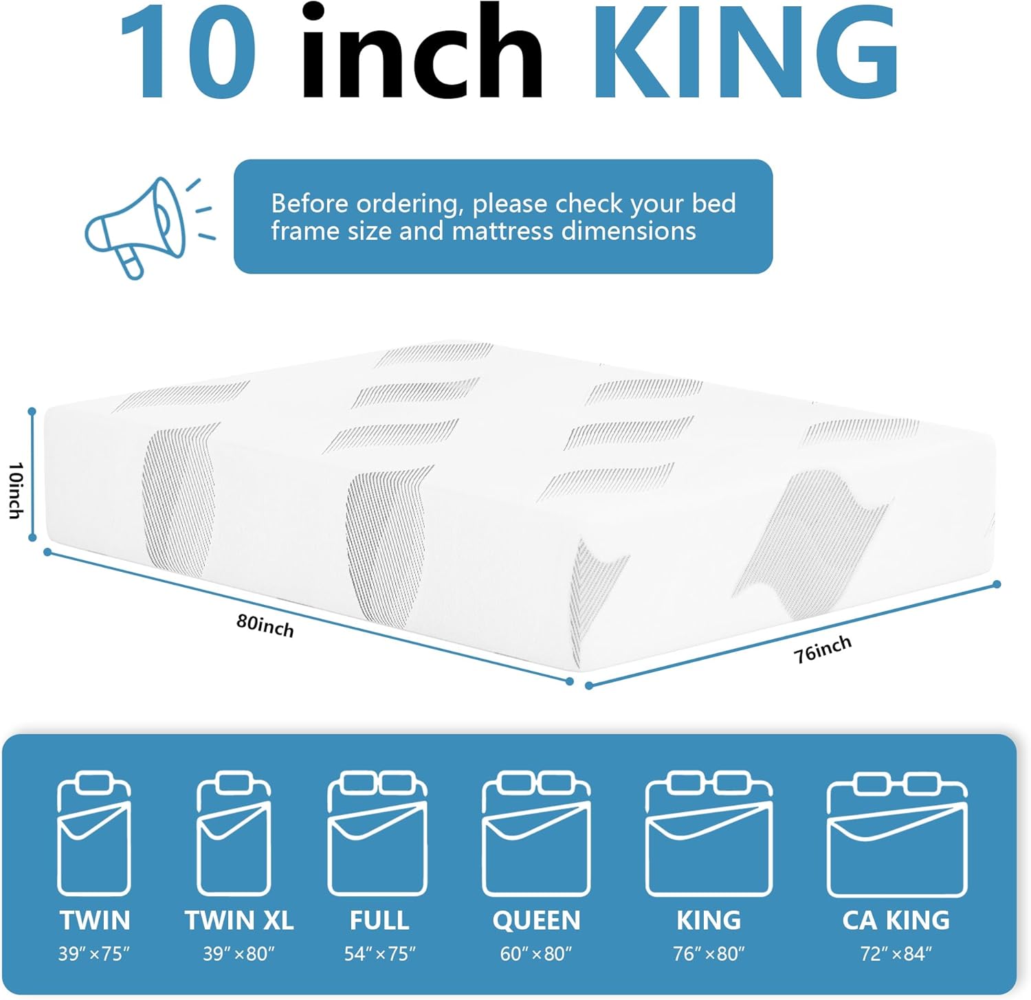 【Pressure-Relieve Comfort】Our king size mattress 10 inch are made of patented premium memory foam material, The three layers of memory foam with different functions interact each other to provide balanced support while effectively absorbing and evenly distributing body pressure. King mattress 10 inch greatly reduces the body’s reaction force and relaxes the muscles. A special layer of Cooling Gel Memory Foam keeps you cool with heat-dissipating technology.
