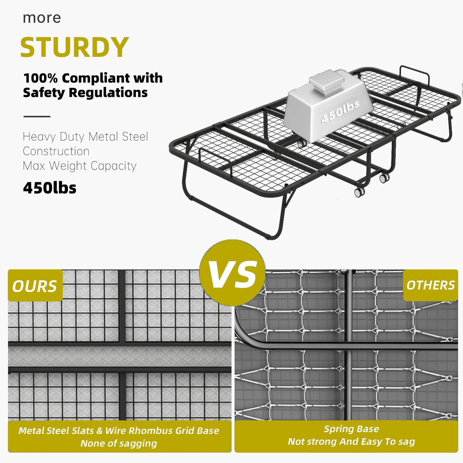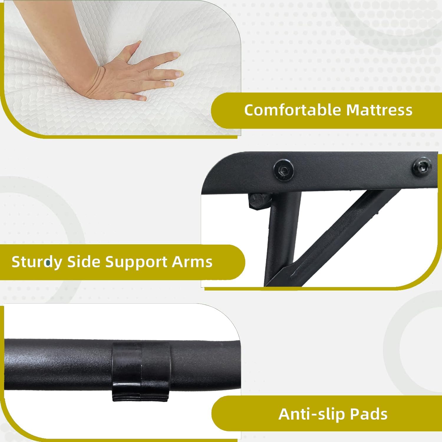 【Strong & Stable Bed Frame 】This foldable bed is built with a high-quality metal frame that is reinforced for maximum durability. The full-steel wire lattice frame is designed to support up to 450 lbs. The 46-inch wide design allows you to have a wider sleeping space.