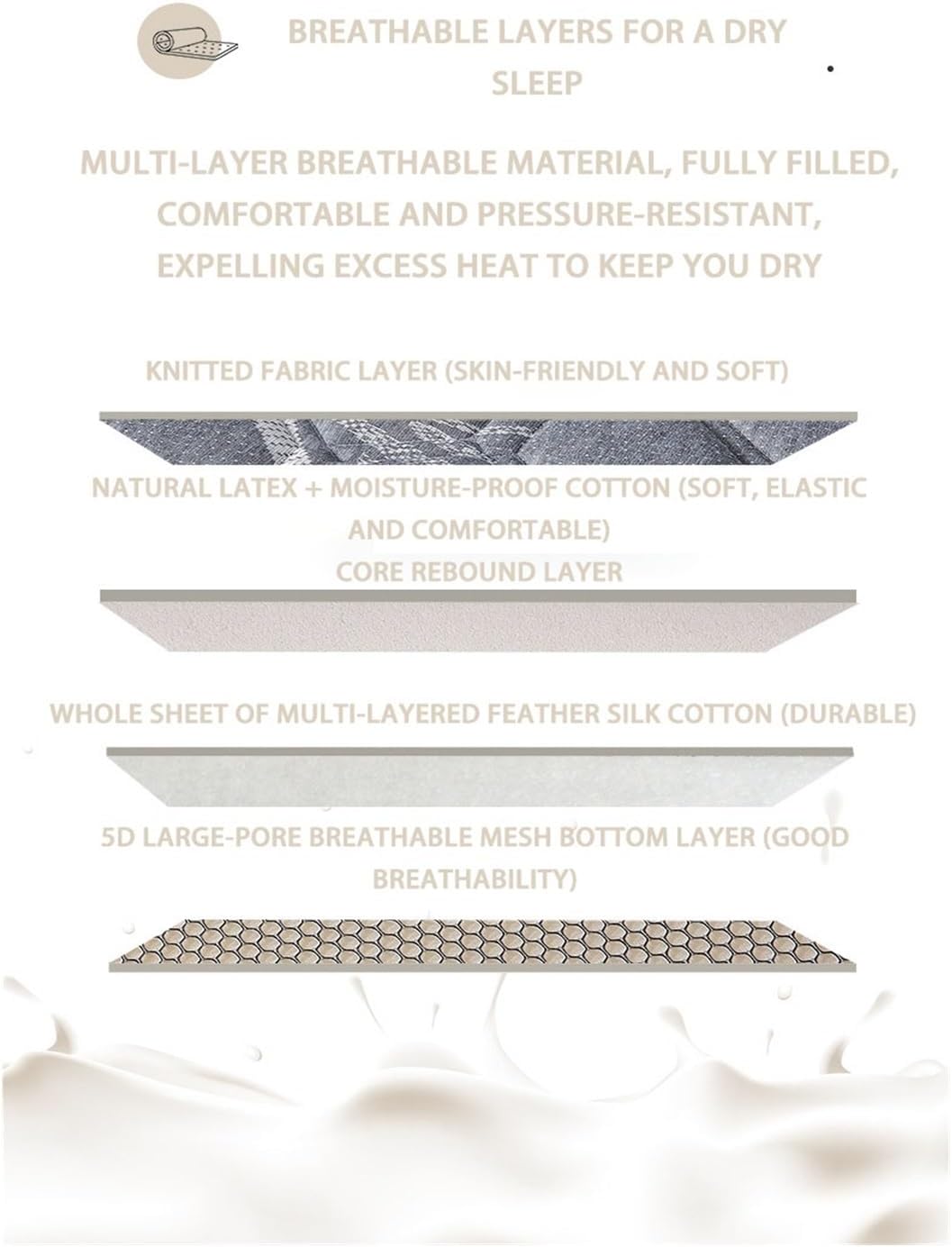 The filling is made of pure natural latex and soft and elastic feather silk cotton. The entire latex layer is Q-elastic, skin-friendly, natural and healthy, soft and pressure-relieving, porous and breathable. The latex honeycomb microporous structure enhances breathability, wicks away moisture and is breathable. The latex’s fine molecular structure prevents any moisture when you turn over or get out of bed at night. It will easily disturb your family and allow them to sleep quietly all night.