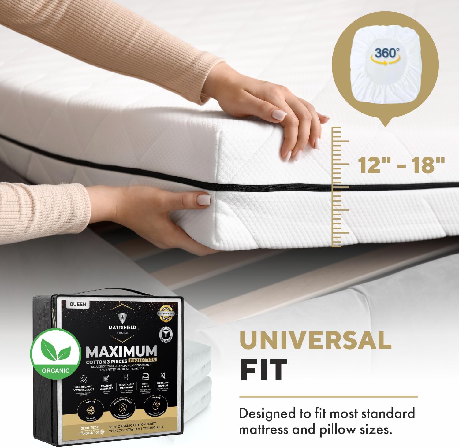 MATTSHIELD New Maximum 3-Piece Kit – 100% Waterproof Organic Cotton Mattress Protector Queen + 2 Pillow Protectors with Zipper, Skin-Friendly, Breathable, Fitted Mattress Cover