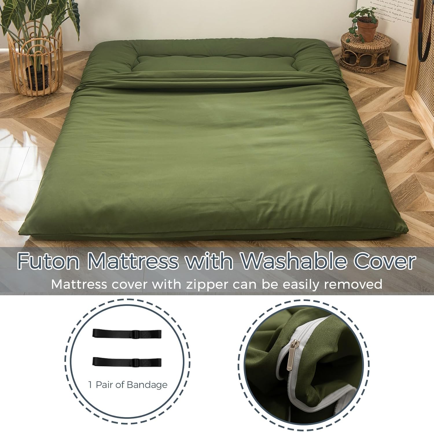 Buy One Get Two Accecories: When you purchase 1 futon mattress, you will also receive 1 dustproof cover of the same color, 1 pair of straps. The dustproof cover can help you keep the mattress clean. The straps can make it easier for you to store and carry the mattress