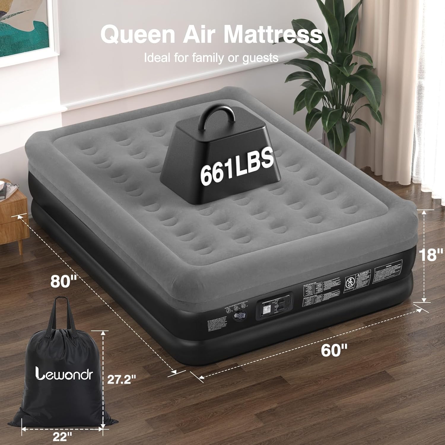 Stable Structural Support: Measuring 80” x 60” x 18”, our queen air mattress provide exceptional support and comfort. With the patented column structure, it can provide full-body support to alleviate pressure points. With the maximum weight capacity of 300kg/661lb, it ensures that you sleep cozily through the night. The heightened protective edge provides you extra comfort and stability.