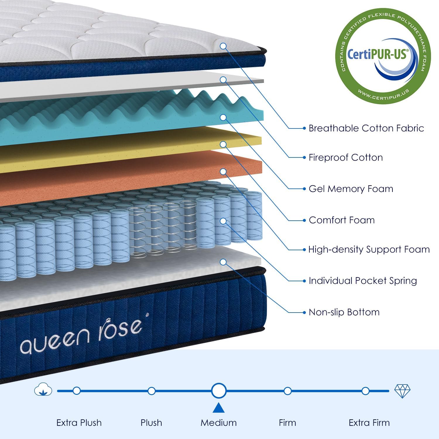 【Superior Support】Constructed with 2.0 mm high-resilient springs that against deformation, the QUEEN ROSE hybrid mattress boasts a durable specialty and medium firmness. It blends with a pillowtop of plush foam layers for an optimal balance of support and comfort
