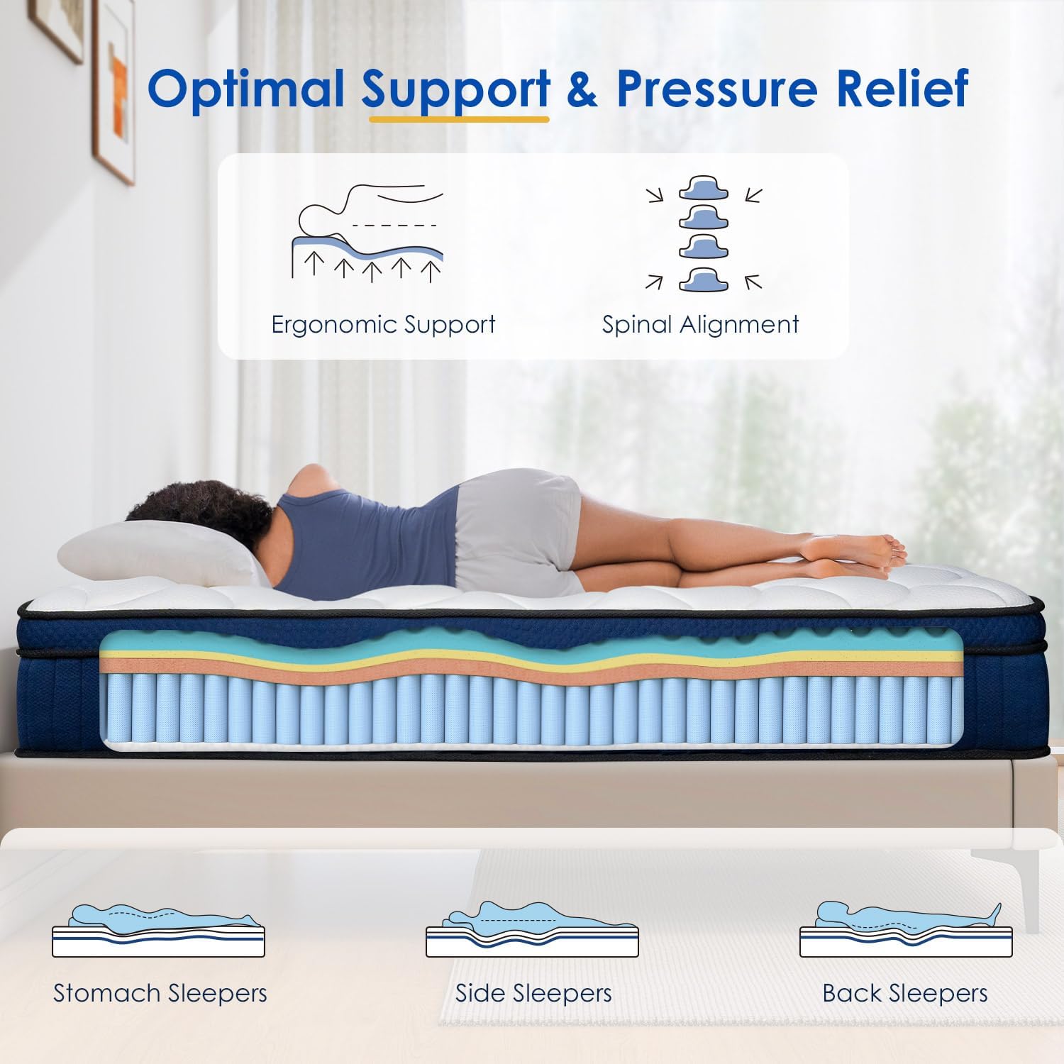 【Breathable Construction】The 10-inch queen mattress features a sweat-wicking surface fabric, cooling and breathable infused memory foam and an unique pocket coil system that enhances air circulation, ideal for people who tend to feel hot during sleep