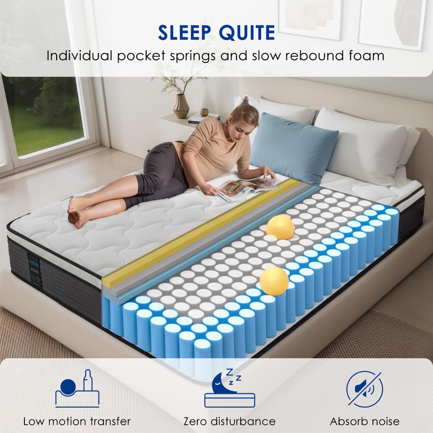 Quite sleep: Built-in independent pocket springs and slow rebound foam, the mattress queen effectively absorb the movement interference between partners, allowing for deep, uninterrupted sleep