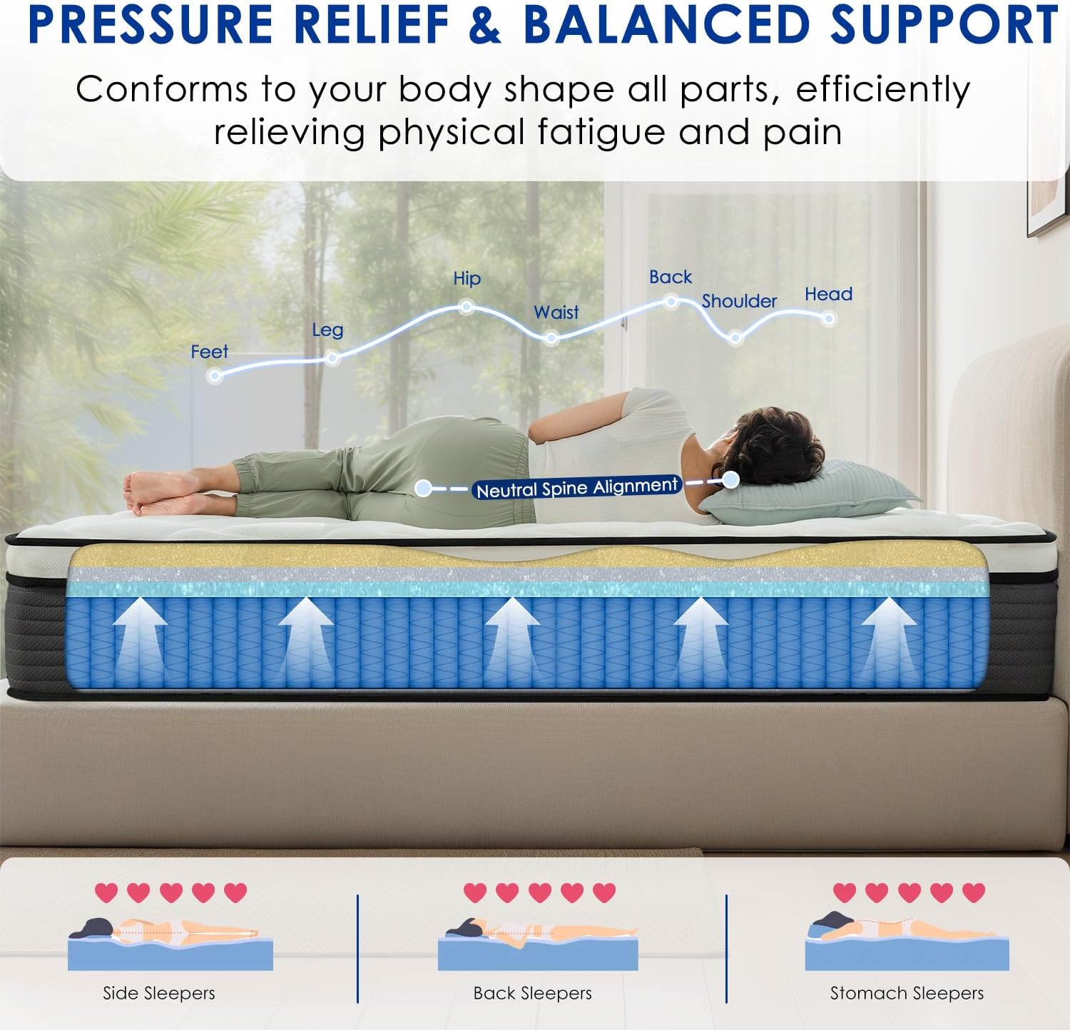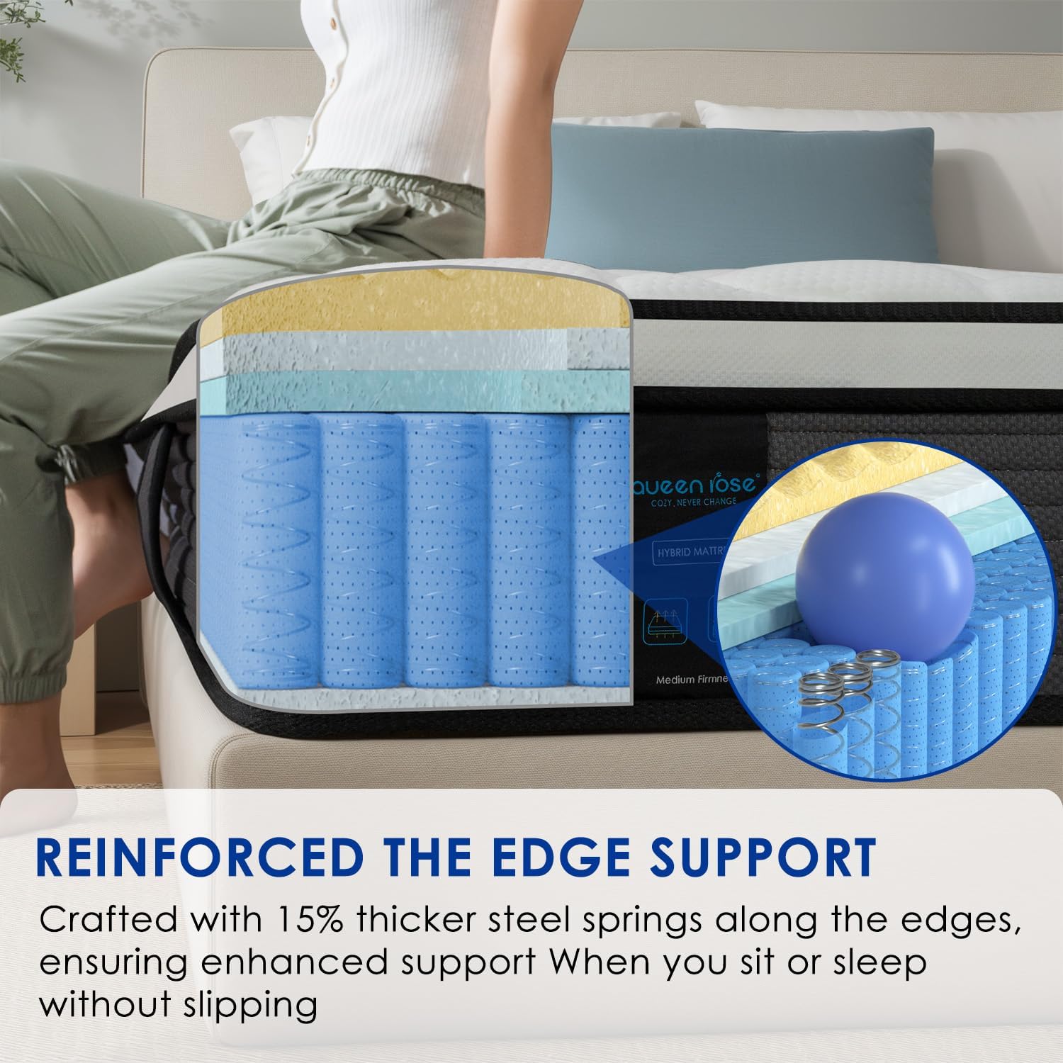 Better Support & Pressure Relief: 15% thicker springs along the edges, enhanced support. The Queen Mattress features individual pocket springs and cooling gel memory foam, ensuring your weight is even distributed on the mattress, efficiently relieving pain
