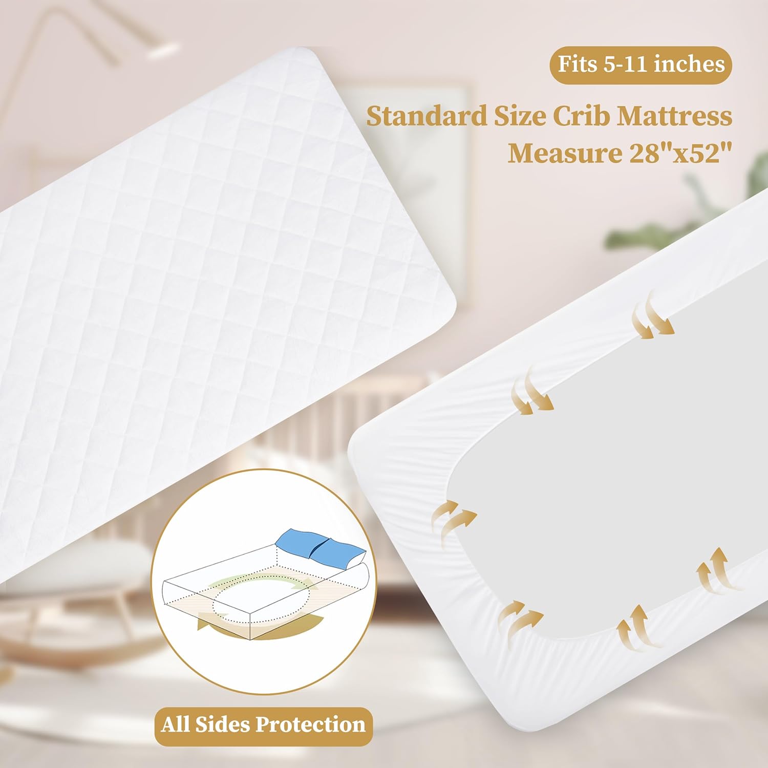 DEEP POCKET DESIGN: The waterproof crib mattress protector(28″x52″). The fitted sheet style with durable elastic band perfectly fits the mattress 5-11″ in depth. The soft knit side material and the stretchable bottom band can wrap the crib completely and prevents sliding, shifting, or slipping. Offering your child a soundly sleeping environment.