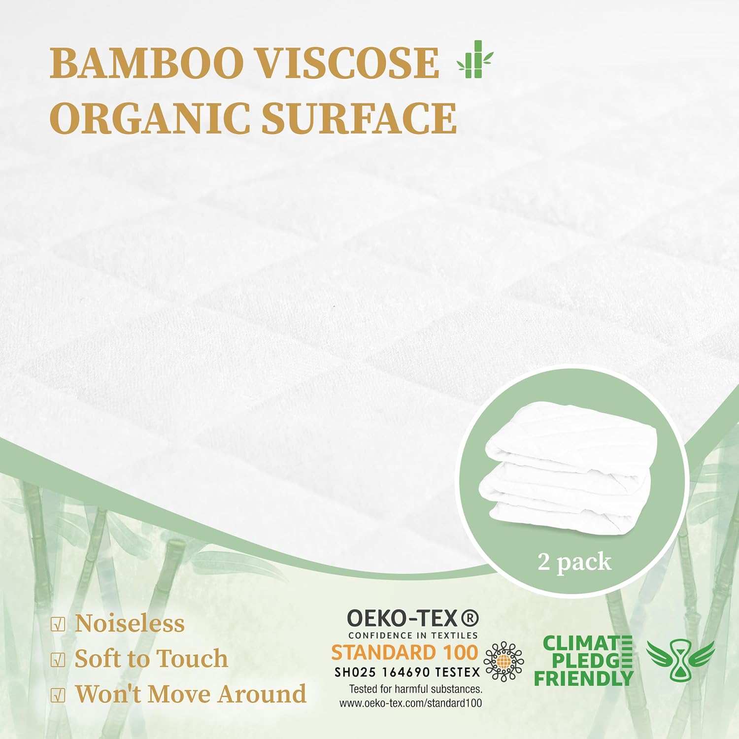 100% WATERPROOF & QUITE: The organic bamboo viscose crib mattress pad has a waterproof TPU backing, which effectively prevents bedwetting, urine, fluids, etc. The premium TPU won’t make any plastic noise when your baby moves. Our baby mattress protector has OEKO-TEX certification, which is 100% vinyl-free and contains no harmful substances.