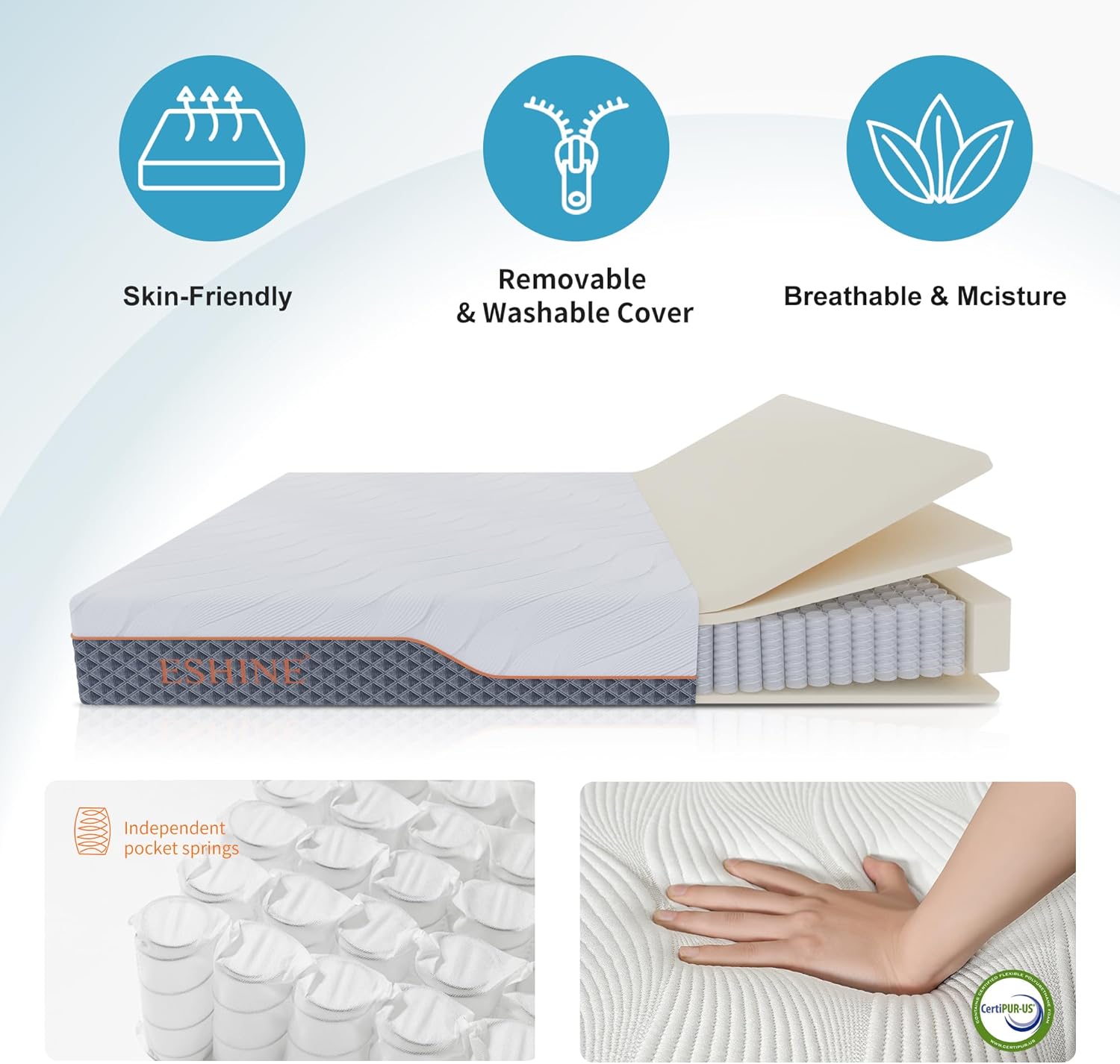 4 LAYERS WITH BAMBOO COVER: 4 layers to relieve pressure, 1.7″ Air Sense Foam + 1″ high-density foam + 6.3″ Spring Mesh + 1″ support foam. Besides, it owns a flame-retardant inner case and a removable bamboo cover.