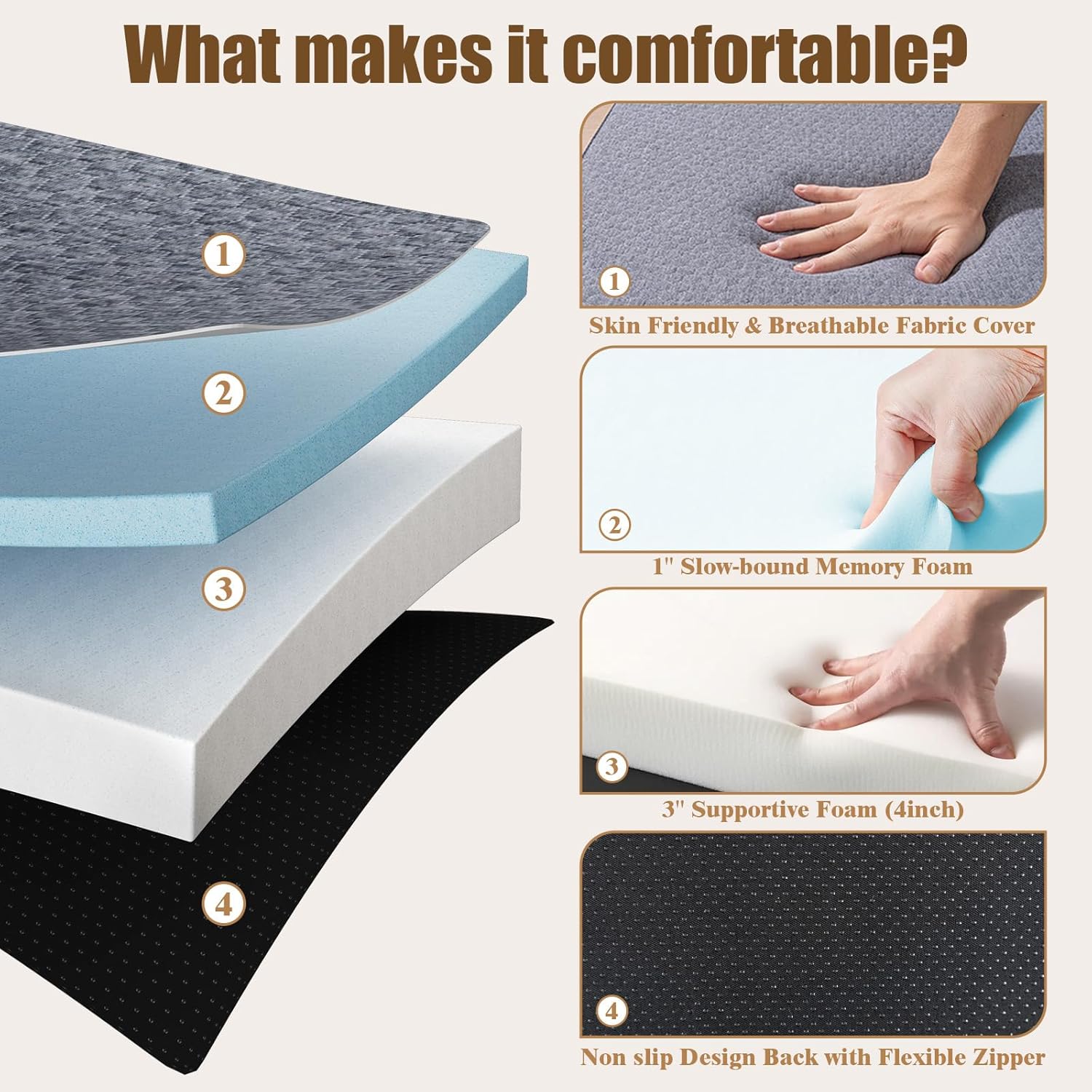 Breathable & Washable Cover: The removable, machine-washable cover is made from breathable fabric with mesh ventilation panels, keeping you cool all night. The anti-slip bottom prevents shifting, ensuring stability on any surface