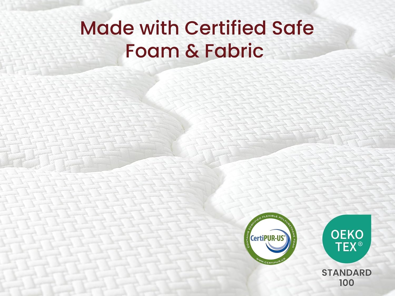 CertiPUR-US Certisfied Foam: Content, emissions, and durability has been tested and certified by independent, accredited laboratories. None of harmful substances and fiberglass, and complies with CFR1632 standards flammability testing and is OEKO-TEX certified, ensuring a healthier sleep environment