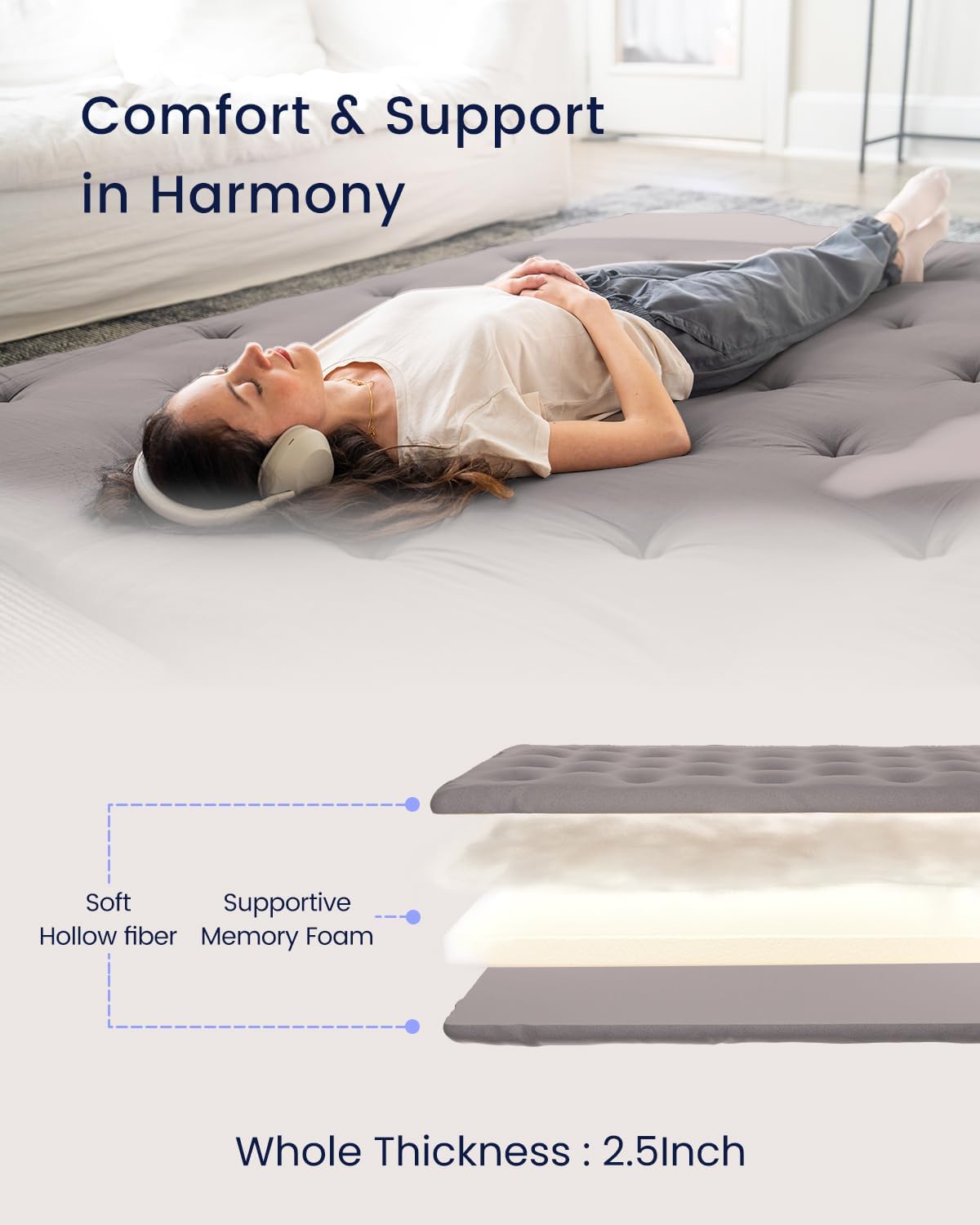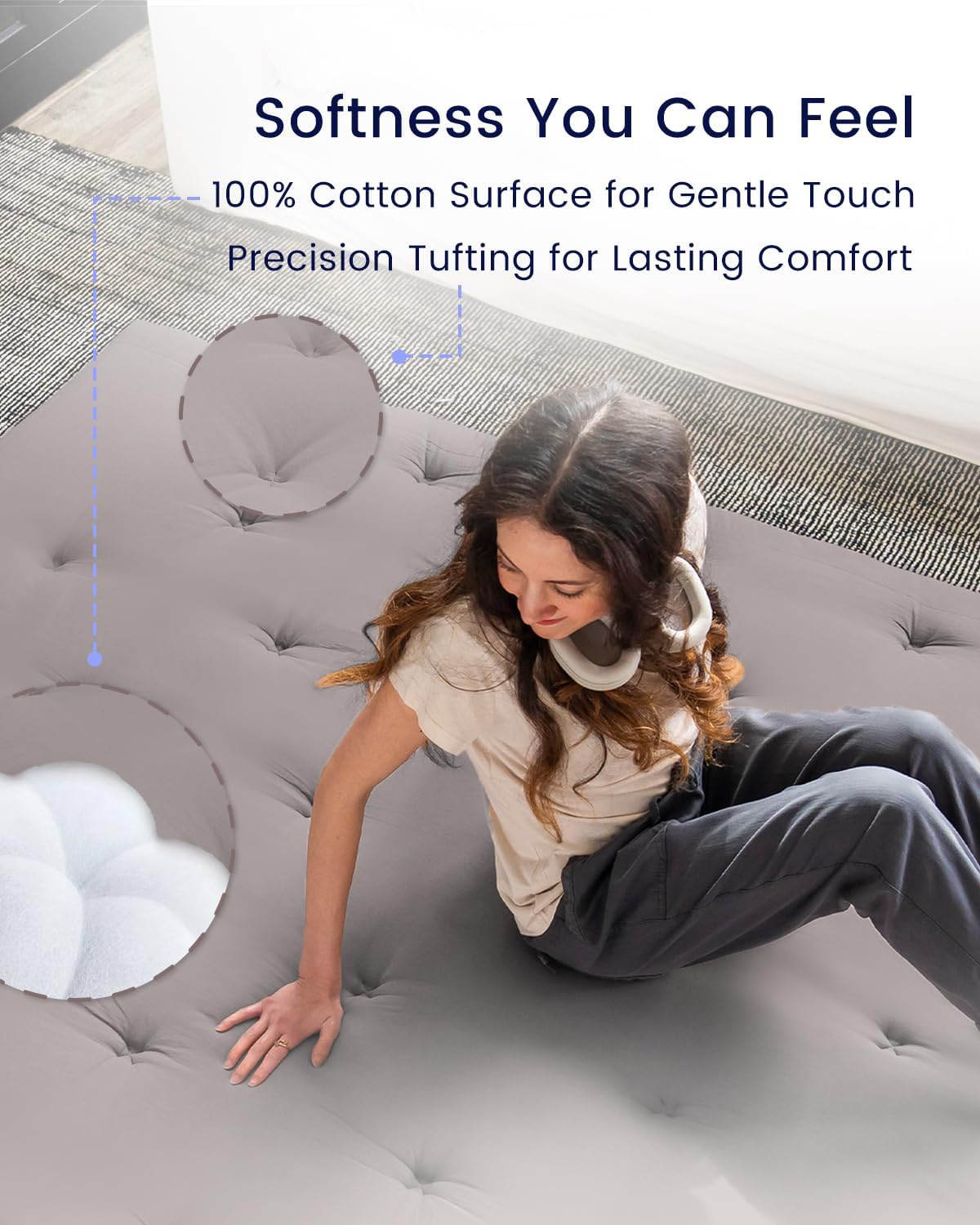 【Multifunctional Mattress】 Perfect as a mattress topper, bedroom futon, living room futon, floor mattress, sleeping mat, tent mat, guest mattress, and more. Ideal for watching TV, camping, picnics, and overnight stays, it’s easy to transport and provides comfort wherever you go. Additionally, its soft and supportive structure makes it an excellent play mat for children, offering a happy and comfortable space for playtime activities.